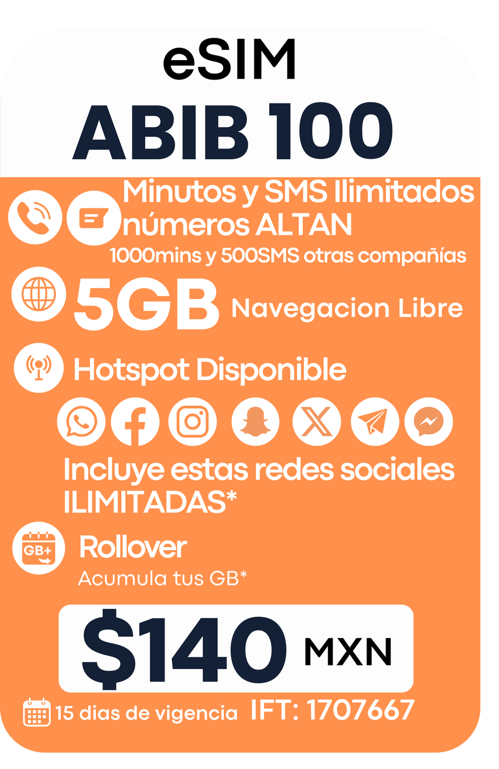 eSIM ABIB®: $40 MXN; SIM física: envío con costo adicional.